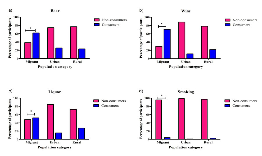 Fig. (1). Proportions of participants involved in alcohol consumption and smoking, stratified by population category *= P<0.05. |